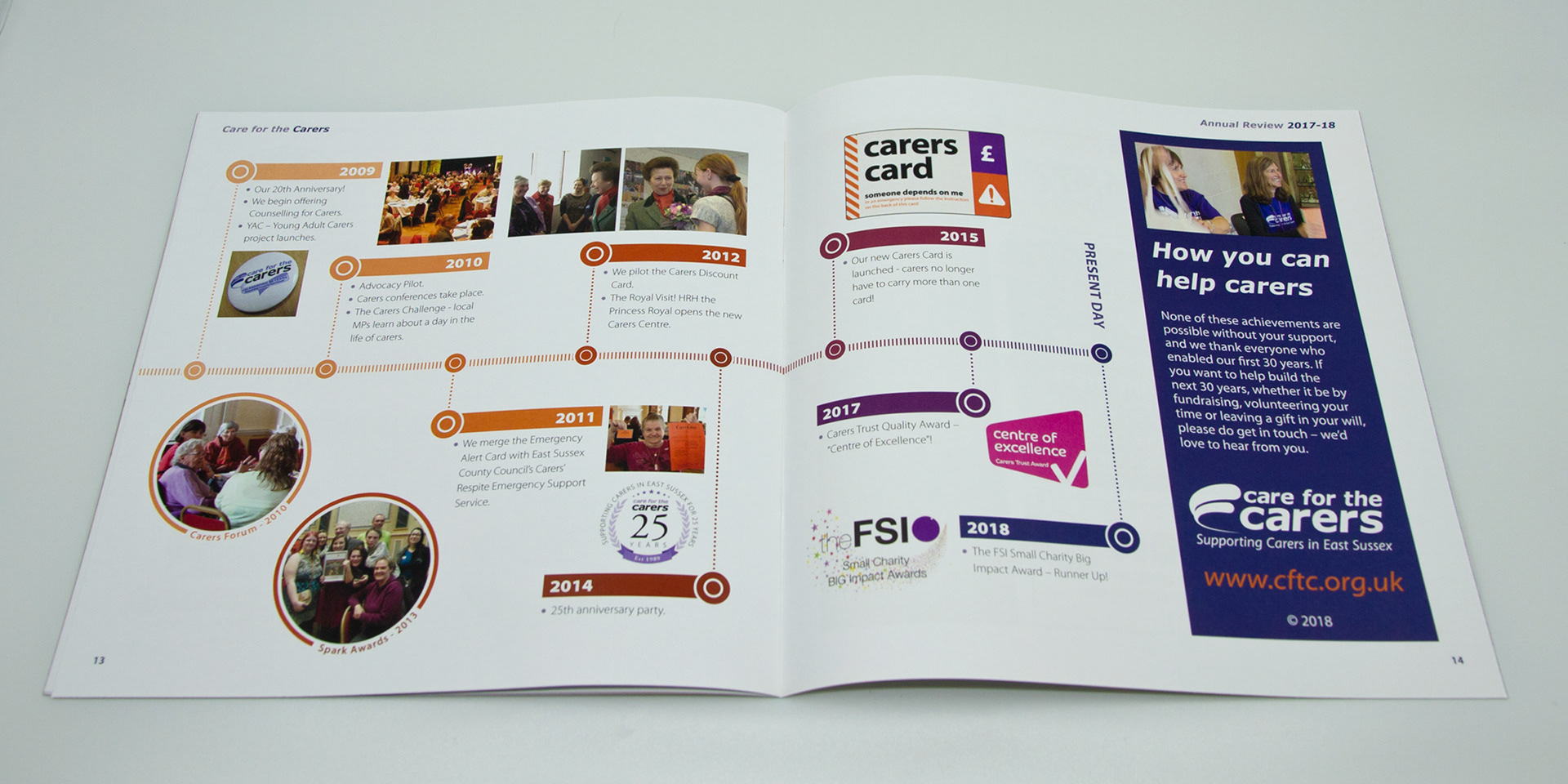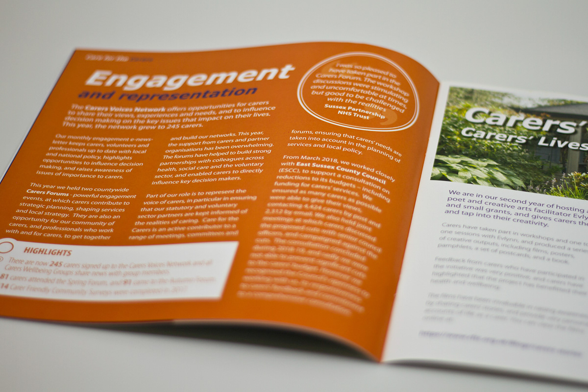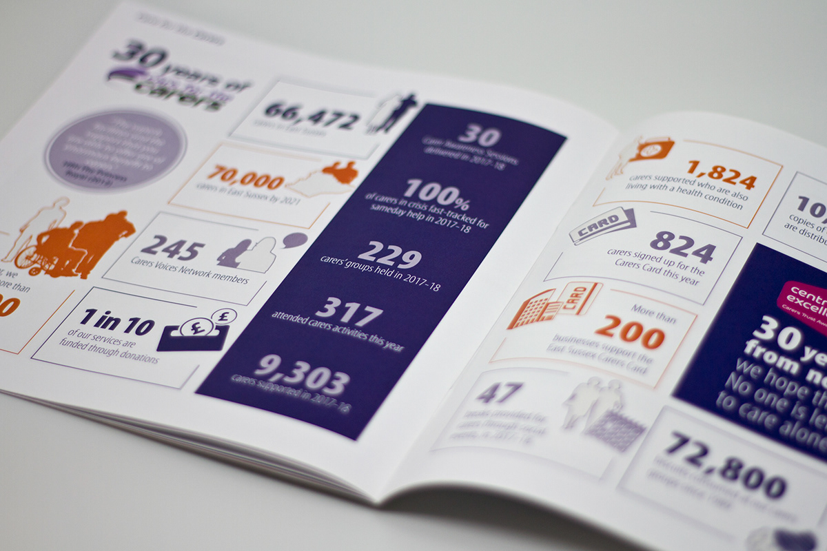 Care for the Carers supports and represents people in East Sussex who care for a relative, friend or neighbour who couldn’t manage without their help. Approaching their 30 year anniversary, I was asked to create a specially commissioned Annual Report, that included a timeline that highlighted key dates and events in their history and infographics reporting on their successes.