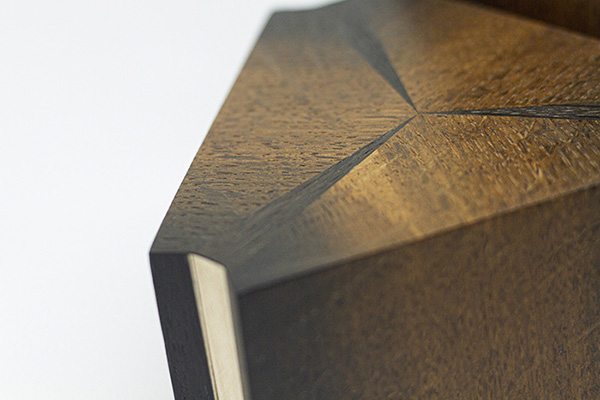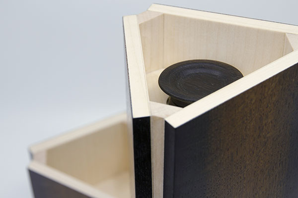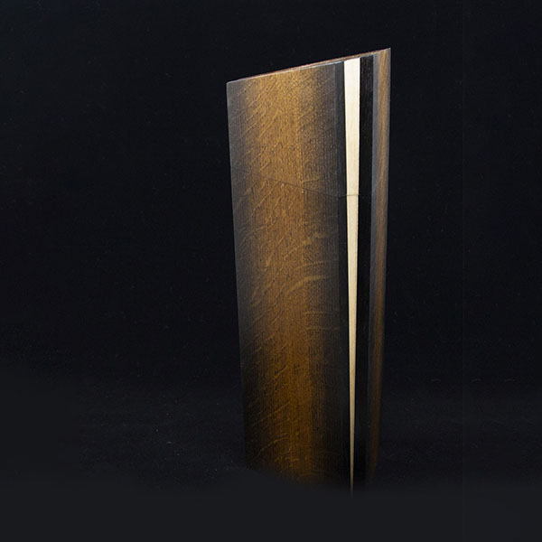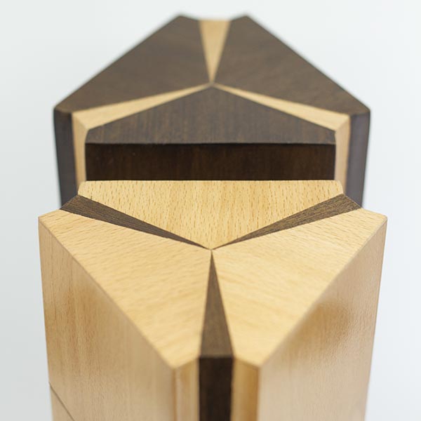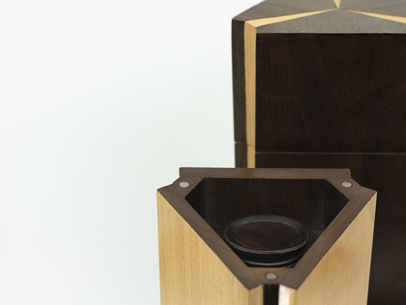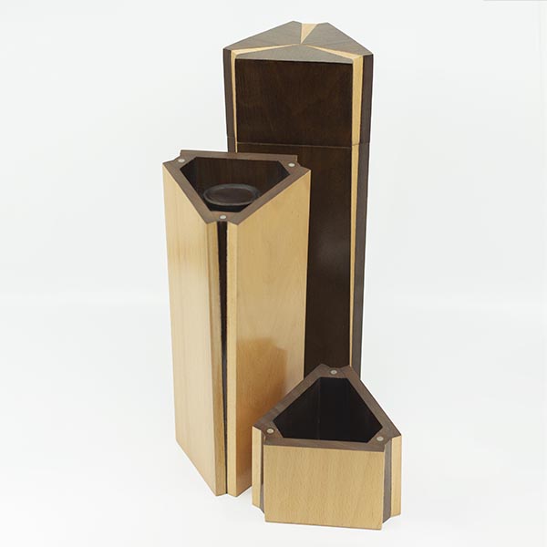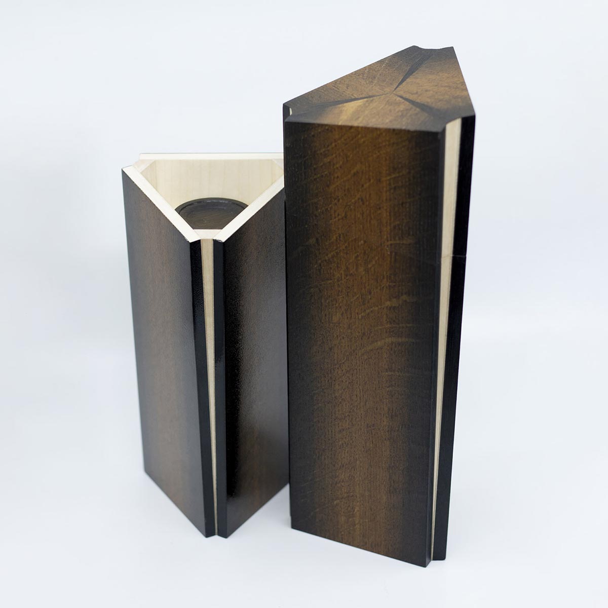 This was a personal project undertaken during my time at Robinson House Studio - a tapered ash casket designed for a much loved and missed pet. Using thin sycamore wedges to obtrude bog oak veneer sides, the triangular containers have asymmetrical angled lids that lift off to reveal a pale sycamore interior. The lower section is designed to safely contain the ashes and is sealed using a threaded bog oak threaded stopper. The top section is kept free to house keepsakes and mementos. Two caskets were made, one finished with a satin hardwax oil that retains the open grain of the oak, while the second uses a full gloss lacquer.