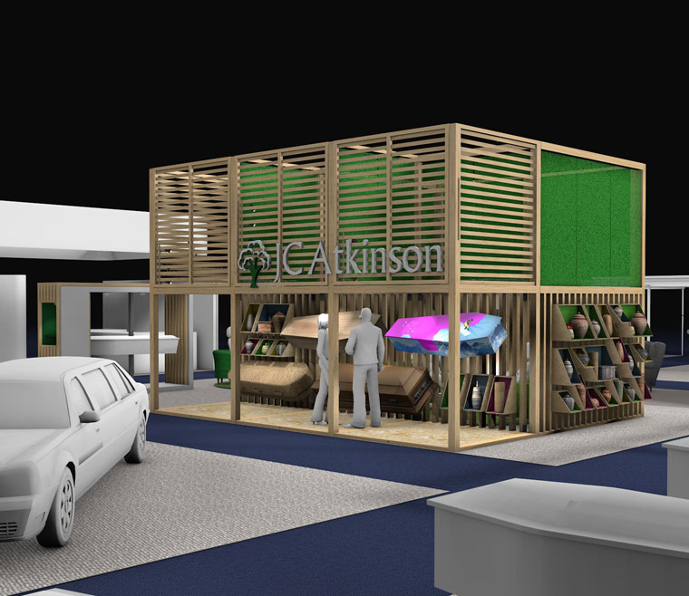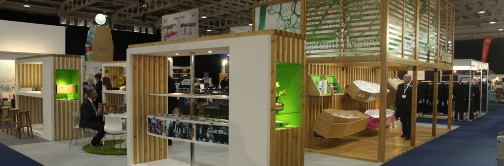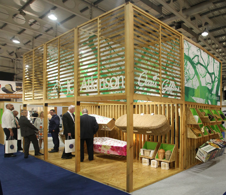 Having work on previous exhibition stands for J C Atkinson, Symian Creative was asked to come up with a new design for the NFE in 2017. With a large footprint to fill, and limited time to build, modular units were created to allow for quick onsite construction and easy storage should the stand be used again. Making use of the full height limitations imposed at Stoneleigh Park, the stand used exposed timber that mirrored the main material used in the manufacture of the coffins and provide a natural finish that alluded to the environmental credentials of the company. The aesthetic of cubic construction was drawn from the popularity of commercial box parks and allowed for reconfiguration at future exhibitions.