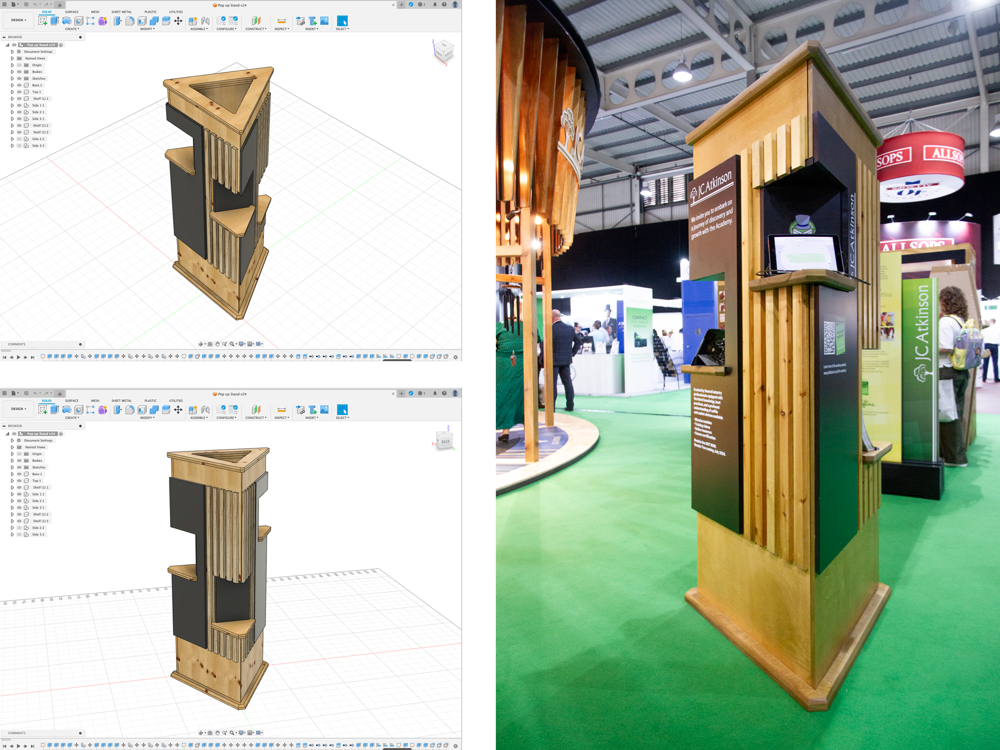 While working on the main J C Atkinson Exhibition stand, I proposed creating a pop up display that fitted in with the main concept, but could be easily dismantled for use at other exhibitons and roadshows that J C Atkinson attends.