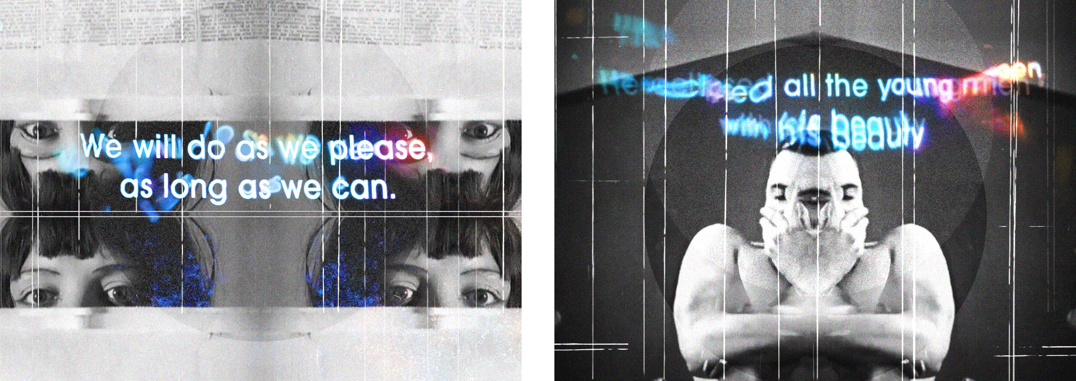 Inspiration for the supporting animation came from the experimental film work of René Clair, Jean Couteau and Man Ray. Splicing these sources together with found footage of Parisian life in a kaleidescopic treatment serves as a background for the recital song translations. These translation have been created digitally and then back projected on a screen and re-filmed through heavily warped perspex. This process produces a distortion that I hope captures the ephemeral excesses and later nilishm of the avante-garde during the interwar years.